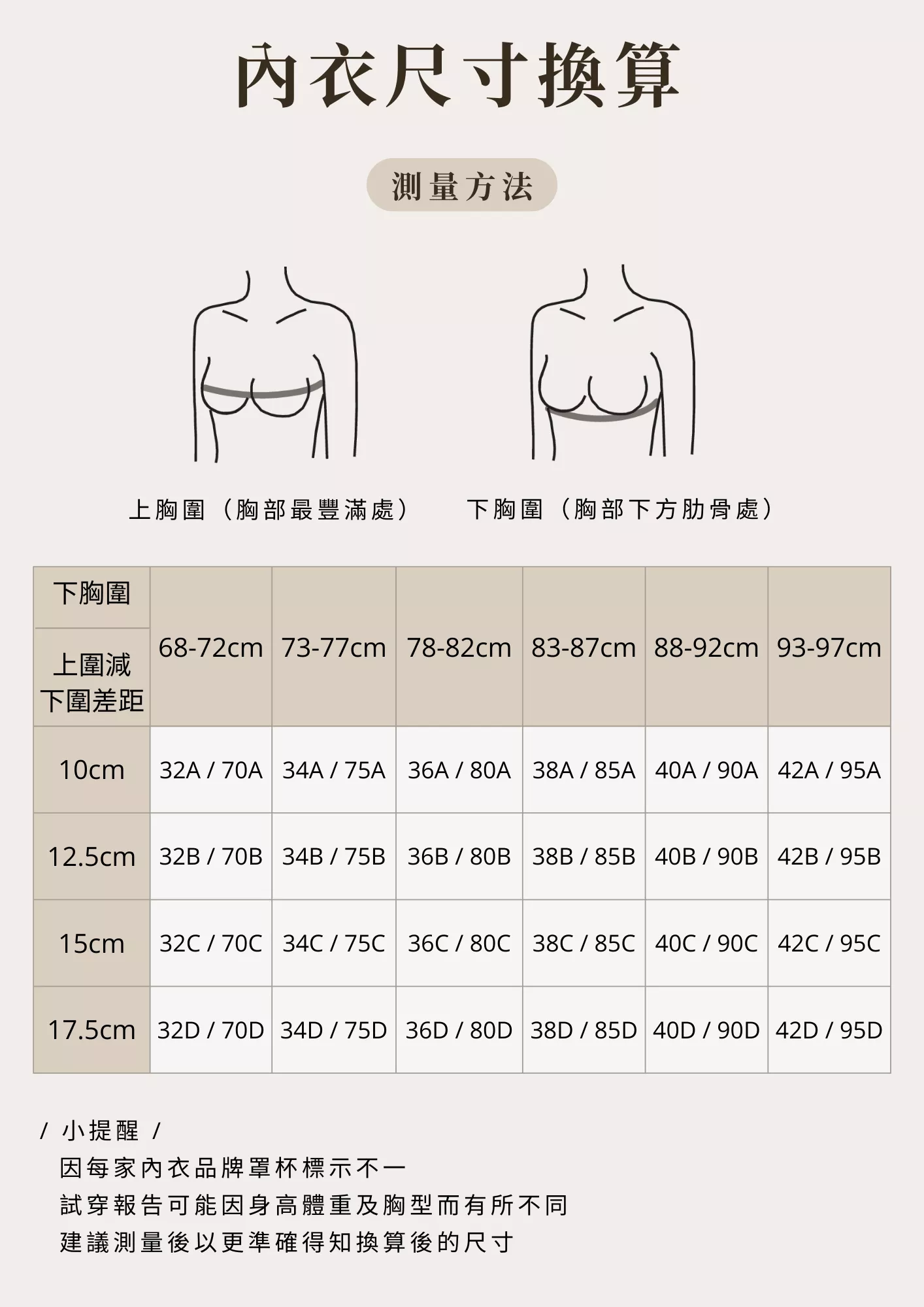 家中如有捲尺建議自行再測量一次會更準確(專櫃量測時,有時會將原本的胸墊一併計入)